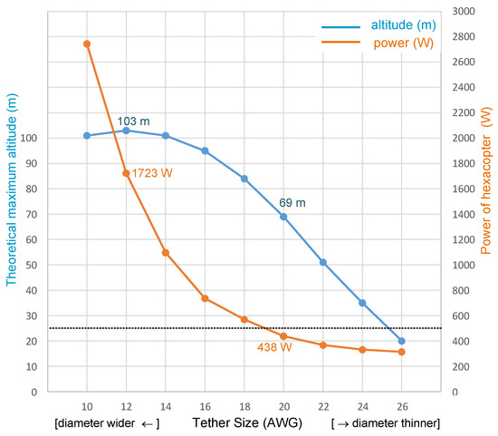 The maximum range or altitude of a tether-powered multicopter is limited by the tether length and the power that can be used. Considering the condition where the hexacopter hovers right above the ground station, the length of tether is equal to the altitude. The power needed by the hexacopter, , for hovering in the air can be expressed as Equation (1).