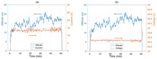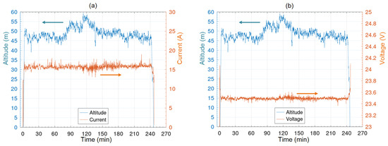 Functional test: (a) altitude/current and (b) altitude/voltage during 50-min flight.