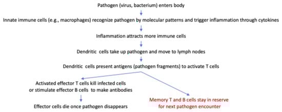 The course of an antiviral or antibacterial immune response is simplified. The pathogen enters the body and is recognized by the innate immune cells through its specific molecular patterns, the cytokines then triggering an inflammation. This inflammation attracts more immune cells, with the pathogen being taken up by dendritic cells and moved to the lymph nodes. The dendritic cells then present antigens that activate effector T cells and memory T cells. The effector T cells either kill the infected cells or stimulate effector B cells to make antibodies, with the effector cells dying after the pathogen is eliminated. In contrast, memory T and B cells remain in reserve to be used in the future encounter of the same pathogen.