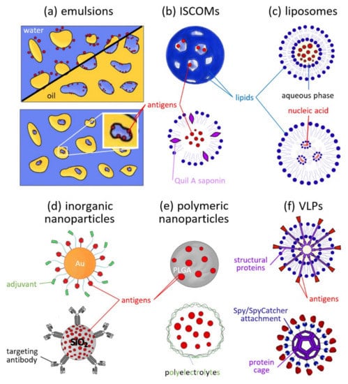 The nanoparticles currently used in vaccine development can be loosely grouped into six categories (Table 1, Figure 2) [5,35].