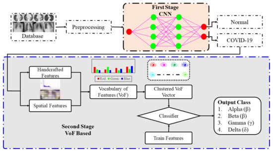 Chest X-rays and CT scans are utilized in this methodology to detect the presence of COVID-19. Initially, the dataset is preprocessed. In preprocessing, all the input images of the dataset are resized to an equal size. Then, 2D discrete wavelet transform (DWT) is applied. This gives us the spectrogram of 2D images. These preprocessed images are used as input for the deep convolutional neural network. If the output of the first CNN is COVID-19, then the handcrafted features are extracted from the gray-scale images as well as spatial features, which are extracted from the three-channel gray-scale images and RGB images. These spatial features are integrated with the handcrafted features to get the vocabulary of features (VoF) vector. This VoF vector is fed as an input to the classifier to obtain the output label. The output labels tell us which COVID-19 variant is present. The proposed framework is illustrated in Figure 2.