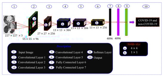 All the preprocessed images are fed into the deep convolutional neural network (DCNN) to detect COVID-19. The DCNN used for the detection of COVID-19 has five convolutional layers (Conv) with a rectified linear unit (ReLU) as an activation function. This DCNN has two fully connected layers named as FC-6 and FC-7. The input layer takes image of size 227 × 227 × 3. The features are extracted with the help of the Conv layers. The prediction and detection are done by the fully connected layers and the final softmax layer. The detection of COVID-19 with the help of DCNN is shown in Figure 5.