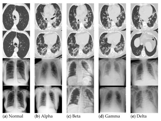 The datasets used for the experiments are the images of the chest X-ray and CT scans. The chest X-ray dataset contains chest X-rays of normal and COVID-19-affected persons. Similarly, the CT scans dataset contains the CT scans of normal and COVID-19-affected patients. The COVID-19 images are categorized as alpha, beta, gamma, and delta. Then, 60% of the dataset is used for training the model, while 20% is used for validation and 20% is used for testing. The total number of images for the alpha variant are 1345, for the beta variant there are 10,192 images, there are 6012 samples for the gamma variant, and 3616 samples for the delta variant. The chest X-rays and CT scan images are publicly available at [4]. For the classification of the delta variant, we followed [28] to arrange our database into different classes of COVID-19 variants. Figure 7 shows the sample images of database.