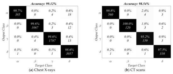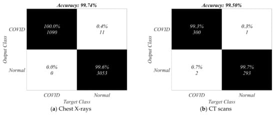 The classification results of the X-rays and CT scans are shown in Figure 13 in the form of confusion matrices. The accuracy for X-ray images was 99.12%, while for CT scan it was 98.54%.