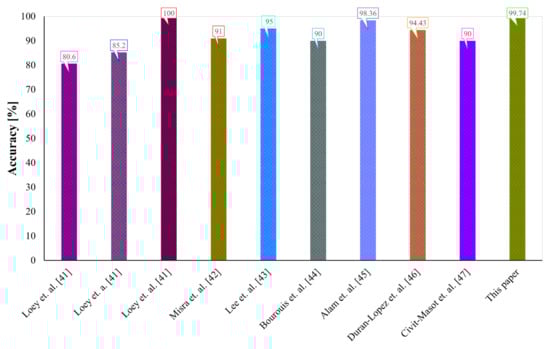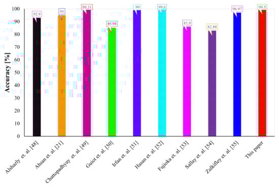 We can conclude from Figure 10 and Figure 11 that the proposed method achieves better accuracy than other methods. The accuracy of proposed method is worse than one model of Loey et al. [41] for X-ray images, but the authors in that article used small dataset as compared to the database used in this paper. Similarly, the accuracy of proposed model for the CT scan images is less than Hasan et al. [52] as the authors used a limited database.