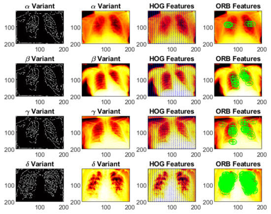 After the detection of COVID-19, we further classified COVID-19 into its variant using the vocabulary of features (VoF) technique, where the handcrafted and spatial features were considered for training the model. The comparison of all variants in terms of handcrafted features in X-ray images is shown in Figure 12.
