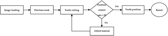 After the image processing is completed, image segmentation is performed. The panoramic dental X-ray shows a large field of view. The heads and necks are included with the mandibular condyles, and the coronoid processes of the mandible are clear, as are the nasal cavity and the maxillary sinuses. Moreover, dentists and oral surgeons commonly plan treatments including dentures, braces, extractions, and implants in everyday practice. Wanat et al. [14] analyzed the characteristics of every tooth in a photograph. It is necessary to accurately segment the entire tooth, including its crown and root [14]. The flow chart is shown in Figure 9: