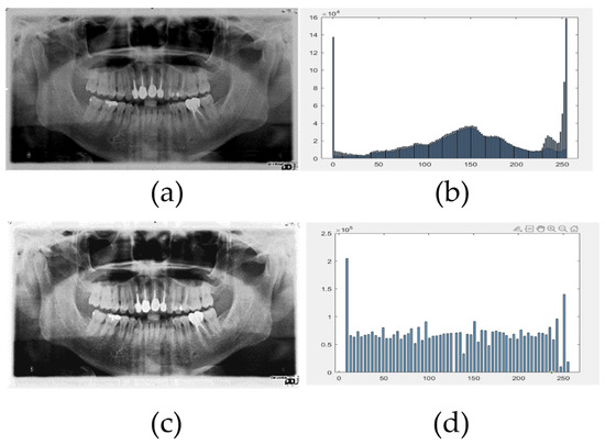 After the processing steps above, the image’s pixels are rearranged to a discrete function in order to achieve an ideal contrast-adjusted image. A processed image is shown in Figure 4, which shows that the gap between the teeth was magnified to high contrast. This effect is also reflected in the histogram. The original pixels are concentrated at lower values. After adjustment, the mean dispersion is relative to each point of the picture.