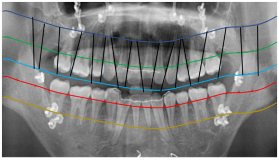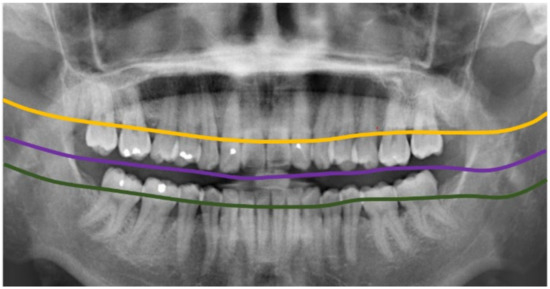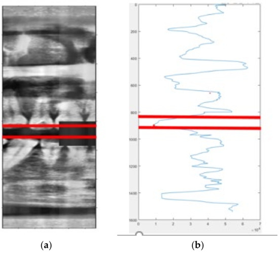 When the radiography was captured, a plastic bite object occluded an area between the upper and lower front teeth. Under X-ray radiation, the pixel value of this object appears similar to that of the teeth. In the case of a missing front tooth, the above algorithm will be inaccurate. In order to solve this problem, the position of the bite piece was fixed roughly in the middle of the mouth, and the altitude intercepts were made closer to each other. Therefore, a height range is given based on the probability of the bite piece appearing. The cavity remains at a low pixel value by being given the same value as that of the cavity to cover it and obtain the correct curve. The complete picture is shown in Figure 11.