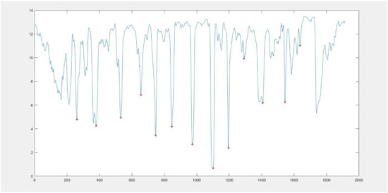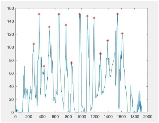 After finding the floss line, the pixels corresponding to the entire curve are compared, and the pixel values of each point are represented by a line chart, with the position of the tooth seam becoming a local minimum value. Poonsri et al. [16] proposed the fixed range of extreme values for the gap between the teeth. The five dimensions of teeth, which are divided into five sizes, are used to analyze the proportions of each tooth on this curve and how many coordinates of the teeth fall into the coordinate range. The maximum extreme value is found in the size range to obtain the coordinates corresponding to each tooth seam. The pixel quality distribution is shown in Figure 14.