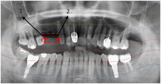 After marking the upper and bottom center points based on Figure 20, we detected where the number of interdental spaces was less than the total number of teeth. First, we judged the area occupied by the small size, specifically when the distance between two teeth exceeds the size of a tooth. If this happens, with this overly large space being filled slightly, Yağmur et al. [21] proposed the following formula to obtain the point location: