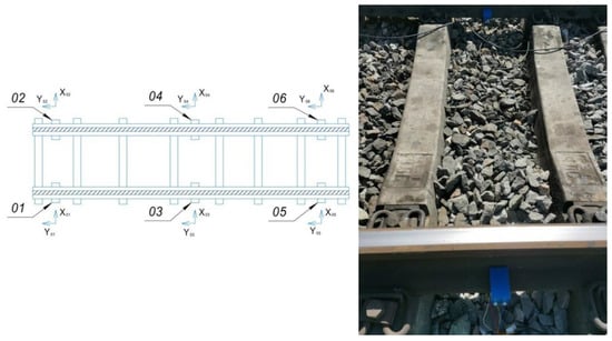 Railway track line stress–strain state testing has certain specifics that have studied in a number of research projects [33,34,35]. It is noted that rail stress can be changed due to thermal and mechanical loads in both longitudinal and vertical directions. Therefore, monitoring the longitudinal rail movement or rail creep is regarded as one of the effective ways to understand the rail’s stress states in critical locations, including fixed structures such as level crossings, turnouts, and fixed top bridges.