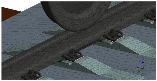 On the basis of the 3D model, we developed a finite element model of a railway track (see Figure 4). The details of the 3D model’s development and the parameters of the numerical model are presented in [57,58,59]. The model includes about two million nodes, including the elements of a hexahedral shape, considering the symmetry properties and the specifications of all the necessary contact points and junctions. The model presents the real structure of the railway track line. In places of stress concentration, the size of the element was reduced to achieve the required accuracy of the simulation results.