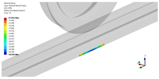 The results of modeling the impact of rolling stock on a section of a railway track with intermediate rail fastenings ZhBR-65SH are presented below in the form of contours of normal stresses and deformations in the elements of the railway track (see Figure 5, Figure 6, Figure 7 and Figure 8 and Table 1). The axial load was 30 ton-force (tf), and the lateral force was 10 tf.