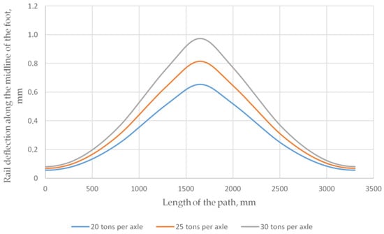 The assessment of the vertical deflection of the rail during the passage of various types of rolling stock is presented in Table 6. In the first approximation, the value of the force transmitted from the wheel is taken to be equal to the static load. The modulus of elasticity of the rail base for a railway track with R65 rails on reinforced concrete sleepers with a diagram of 1840 sp./Km is about 150 MPa.