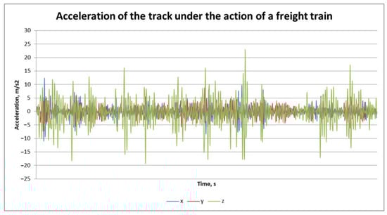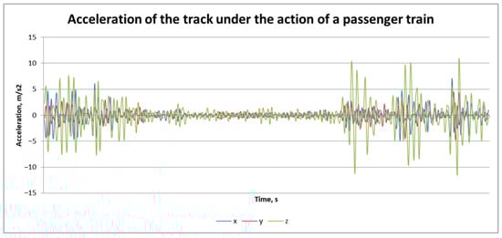 The data on the impact of freight and passenger trains on the railway track are presented in Figure 11 and Figure 12. The figures present the acceleration data obtained from sensors installed on the rail under the dynamic impacts of freight and passenger trains on the railway track, based on the first sensor. The maximum amplitude of the track acceleration of freight trains was 41 m/s2 on the first sensor on the vertical (z-axis), and that of passenger trains was 23 m/s2, which corresponds to the actual condition, since the mass of freight train cars is higher than that of passenger trains. This parameter characterizes the vertical forces acting on the track under the influence of the mass of the wheel set acting on the axle.