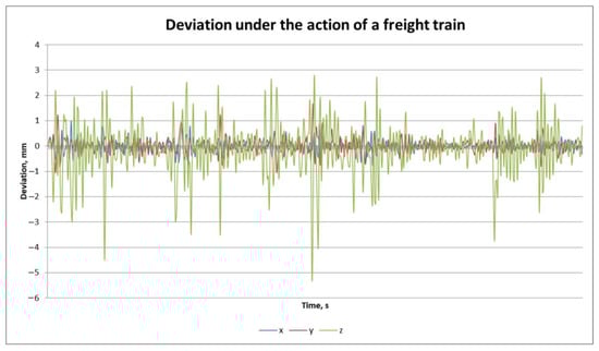 Compared with the real railway track deviations (calculated using the acceleration data) resulting from passenger and freight trains, the values calculated as the result of modeling are in good agreement. This fact proves the possibility of using high-precision accelerometers for railway track stress–strain analysis.