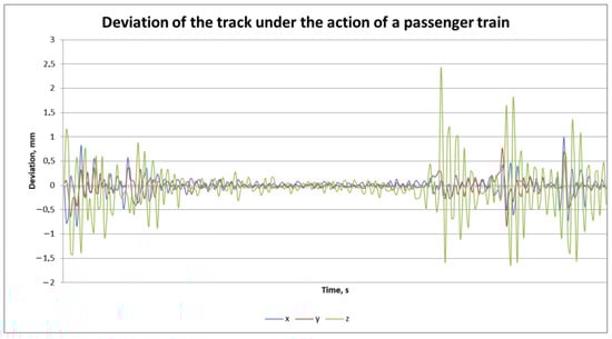Deviation of the track along the axes under the action of passenger trains on the first sensor.
