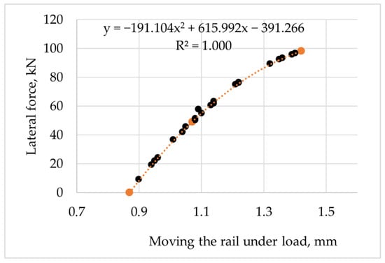 Thus, knowing the type of rolling stock with the corresponding axle load, and by measuring the rail movement, it was possible to determine the lateral forces acting on the rail from the wheels of the rolling stock, and to establish the parameters of the stress–strain state of the track elements using the equations of approximation and linear interpolation.