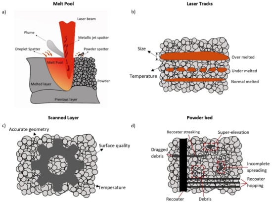 Laser tracks are a combination of simultaneous meltpool coming together to form one scan vector of the part being printed. The laser track’s size, temperature, and continuity highly affect the quality of the printed parts, as shown in Figure 2b []. The layerwise signature considers the printed part at a larger level of detail and can be divided into two partitions. The first partition is the scanned geometry, designating layers after the laser scans the geometry, as shown in Figure 2; this slice can be compared to the original geometry to check for errors. Besides this, the temperature can be monitored, as well as the surface quality. The second partition is related to the powder bed, after a fresh layer of powder is spread, as illustrated in Figure 2d. The errors related to the recoater include hopping, where the recoater has many chipped ends, and streaking, when parts of the debris are dragged by the recoater. In addition, the presence of debris on the surface might indicate the presence of a defect. The superelevation of melted parts may appear or incomplete powder spreading may occur.