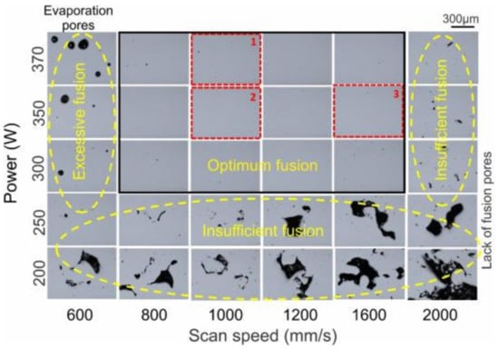 The porosity formation mechanism and its undesirable effects have been investigated frequently in the literature [,,]. The presence of porosity affects the mechanical integrity, especially the fatigue life of L-PBF parts []. Figure 4 illustrates the effect of process parameters choice on the type of porosity formed in an aluminum alloy manufactured by L-PBF []. Generally, porosity can be classified according to its geometry, spherical (gas-induced) and non-spherical (process-induced). Gas entrapped in powder particles during the gas atomization process contributes to gas-induced pores []. These spherical porosities can also be attributed to the vaporization of low melting point elements during the L-PBF process []. Process-induced porosity formation mechanisms are mainly attributed to a lack of fusion and keyholing [,]. The lack of fusion porosity is related to the insufficient overlap of successive meltpools [,]. Therefore, powder remains un-melted, causing a reduction in the overall density of the part. In contrast, the keyholing phenomena are caused due to the significantly higher laser beam power that causes the metal evaporation and leads to the formation of plasma []. This causes the laser beam to penetrate the melted part deeply and forms a vapor cavity within the part []. The porosity formation can be monitored by in situ temperature measurements and a proper understanding of how thermal history affects the formation mechanism.