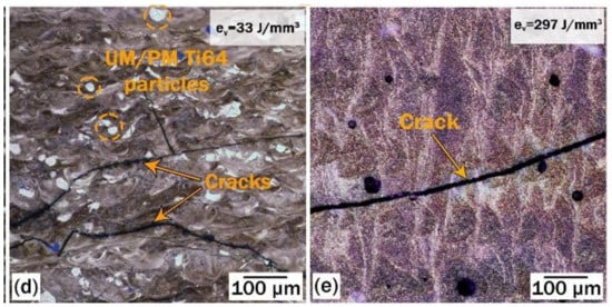 Optical micrographs showing some cracks formation in a B4C/Ti64 composite []. (d) at low energy density and (e) at higher energy density.
