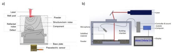 Acoustic emission (AE) is a non-destructive evaluation method that has been employed for defect detection of manufactured parts for decades []. It has recently been applied for online monitoring of the welding process due to its ability to characterize and detect weld defects in real time []. Acoustic emission is “the generation of an elastic wave by the rapid change in the stress state of some regions in the material” []. This change can be related to microcracks formation, pores, evaporation dynamics, and temperature gradients []. These sensors can be fixed within the build plate to collect structure-borne acoustic emissions or along the build chamber walls to collect air-borne acoustic emissions, as shown in Figure 6 []. The working principle of the AE sensor used can be based on piezoelectric transducer (PZTs) or optical fiber sensors []. Generally, piezoceramic transducers are used to detect structure-borne acoustic emissions, while regular membrane microphones are used to detect airborne acoustic emissions. There is higher damping in the air than solid. Therefore, a broader frequency spectrum can be measured in solids [].