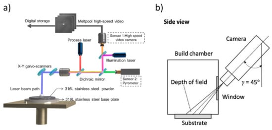 Schematic illustration of different vision sensor locations for in situ monitoring of the L-PBF process. (a) Represents a coaxial setup where the camera can follow meltpool locations []. (b) Off-axis location of the camera, where the camera is positioned on the side window of the chamber [].