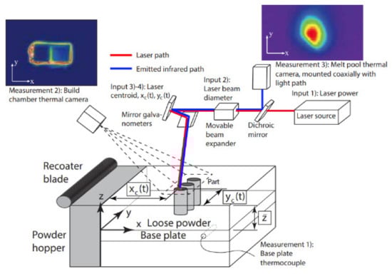 Different combinations of temperature sensors: a thermocouple drilled in the baseplate, an off-axis thermal camera to detect overall powder bed temperature and heat distribution, and a coaxial thermal camera to detect meltpool temperature [].