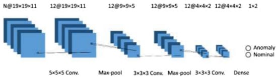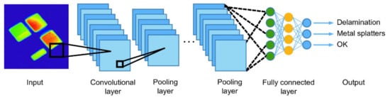 Classification tasks are used to differentiate between different groups of defects or quality levels. If infrared cameras or vision sensors are used, a convolution neural network can be used to separate different classes. For instance, Baumgartl et al. [] proposed using a convolution neural network (CNN) to classify infrared images captured from delamination, spatters, and high-quality parts. The input, in this case, represents images acquired from the infrared camera for the parts being melted. The parts were printed at known process parameters that will induce specific conditions; the data labeling was performed manually in this case. Each input is regarded as a three-dimensional array; multiple small-filter kernels are applied to the image array. The convolutional layers combine several layers such as activation, batch normalization, and pooling layers to extract useful features from raw data and classify them into specific target classes. As illustrated in Figure 10, the output is to associate each layer of the parts printed to three different classes: accepted, metal splatters, or delamination.