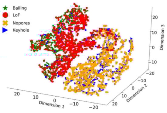 Clustering algorithms are among the most common unsupervised learning algorithms and are typically used for anomaly detection in AM applications. This method is usually helpful when used with a large amount of data and has the advantage of not requiring human interaction, and is, therefore, very convenient for defect detection. A clustering approach was applied to acoustic emission data collected during the L-PBF process. The ML model input was a series of AE signals collected during printing laser tracks at different melting conditions, namely under-melting, over-melting, keyholes, and balling conditions. The objective of the model was to classify the AE signals at each melting condition. Visualizing the data was made easier by applying a t-SNE clustering approach, as illustrated in Figure 11 []. The authors were able to group different melting conditions in specific regions on the 3D map, which can then be used for anomaly detection. A clustering approach using a hierarchical K-means and Gaussian mixture model was also used to classify AE signals related to pores and cracks [].