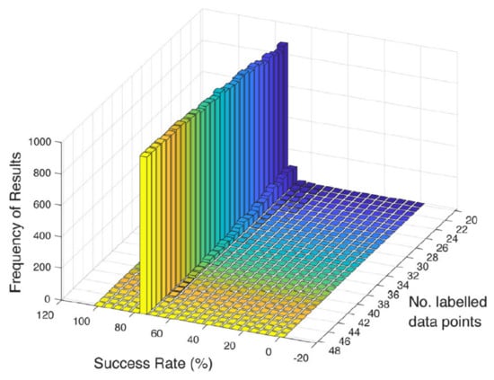 Histogram of algorithm success rates for the semi-supervised ML results proposed by Okaro et al. [], obtained over 1000 runs of Monte Carlo simulation as a function of the number of labeled data points.