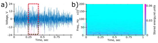 A fiber Bragg grating AE sensor to detect the airborne signals by attaching the sensor to the inside wall of the build chamber 20 cm away from the build plate was utilized by Wasmer et al. []. A standard wavelet packet transform (WPT) was used to extract the frequency bands of the raw AE signals, and signals were analyzed in the time–frequency domain in the form of spectrograms, as illustrated in Figure 15a represents the AE signal collected in the time domain, while Figure 15b represents the spectrogram of the AE signal in the time–frequency domain. A CNN was used to classify the AE signals collected from parts at different density levels. This method was able to classify the different quality levels between 79–84% accuracy. The same research group tested the use of SCNN on the same AE signals; the accuracy was slightly improved to 83–89% when using a fixed running window to analyze the time–frequency domain []. The long and short running window approach was again tested with SCNN and resulted in higher classification accuracy (78–91%) than other classifiers (CNN, Xception, ResNet). The same AE signals were classified using an RL approach to minimize the time needed for training and data labeling. The accuracy of classification was, however, limited to 74–82% [].