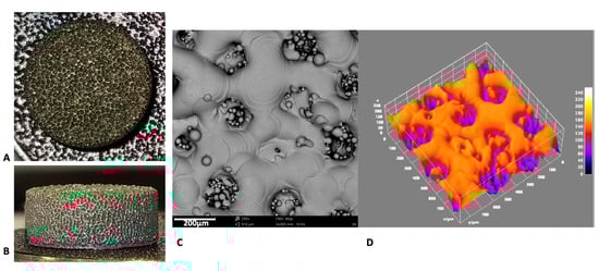 The microscopical aspect of the novel disc presented with a very high porosity and a uniform 3D framework at the SEM observation (Figure 1A,B). At 480× of magnification, the surface appeared as a net of melted metal uniformly interconnected by craters, filled by sintered metallic particles (Figure 1C). The porous aspect of the material was even more evident from the 3D reconstruction (Figure 1D).