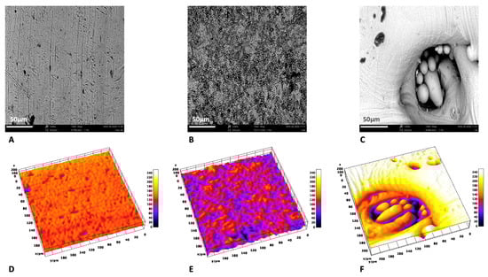 Comparison of SEM images at 1200× with the respective 3D reconstruction: machined (A,D), DAE (B,E), and 3D (C,F).