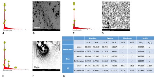 Spectra of energy dispersive X-ray spectrometry (EDS) analysis at 5 kV of machined (A), DAE (C), and 3D (E) titanium discs with the respective picture of the surfaces analyzed at 1200× (B,D,F). (G) The chemical composition (average values ± standard deviation) of the samples analyzed by EDS at 5 kV.