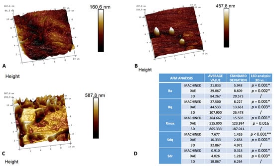 Three-dimensional reconstruction of AFM images of the different surfaces: machined (A), DAE (B), and 3D (C) with the relative table (D) of the average values (+/− standard deviation) of the surface nano-roughness parameters measured: surface roughness (Ra), root mean squared surface roughness (Rq), maximum surface roughness (Rmax), root-mean-square of the surface slope (Sdq), developed interfacial area ratio (Sdr), and the post hoc LSD analysis of intergroup comparison between nano-topographical parameters measured on AFM observations * p-value < 0.05. ** p-value < 0.001.