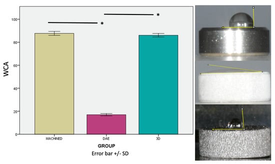 The analysis of the wetting properties of the samples showed that the DAE samples’ WCA was significantly lower with respect to the other two groups, p < 0.001 (Figure 5). On the contrary, the WCA of the machined (87.713° ± 1.732) and 3D discs (86.094° ± 1.535) showed no significant differences.