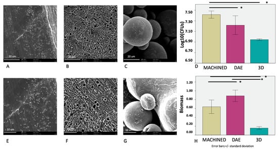 SEM observations of the different surfaces covered by the bacterial biofilm: machined (3900× A, 6100× E), DAE (3900× B, 6100× F), and 3D (3900× C, 6100× G). The average values of the colony forming units (log10)/mL (D) and biofilm mass formation (H) of S. oralis at 48 h (error bars = +/− standard deviation). * p significant at 0.05.