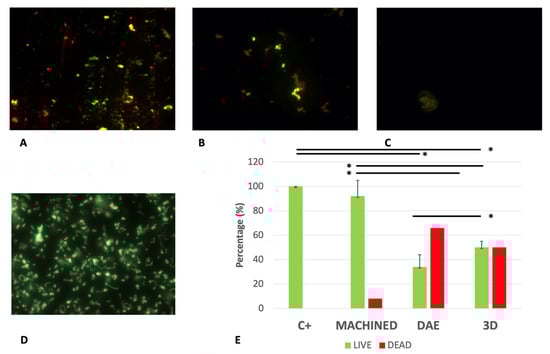 Representative images of live/dead staining of Streptococcus oralis biofilm growth on different titanium surfaces: machined (A), DAE (B), and 3D (C) samples and positive controls (D). Average percentage of viable (green) and dead (red) cells on different groups (E). Error bars = +/− standard deviation. * p-value < 0.01.