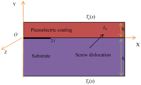 As shown in Figure 1, the fine-grained ceramic powder is prepared by high-efficiency mechanical ball milling, and then bonded with the substrate by plasma spraying technology to form the coating/substrate structure, while an open crack with a length of is along the interface between the coating and substrate. A fine-grained piezoelectric coating/substrate structure was obtained by polarization treatment of coating. The coating is polarized along the -axis. Assumed that coating and substrate are transversely isotropic. During the heating process of coating preparation, crystal deflection or bending may be caused, resulting in dislocation. Therefore, we assume that the screw dislocation with dislocation line parallel to the poling direction are situated at in fine-grained piezoelectric coating, in which and are the classical elastic displacement jump and the electric potential jump, respectively. The thickness of coating and substrate are and , respectively. It is assumed that the crack faces remain thermally and electrically insulated and , are environment temperature.