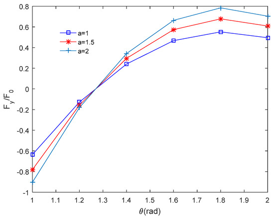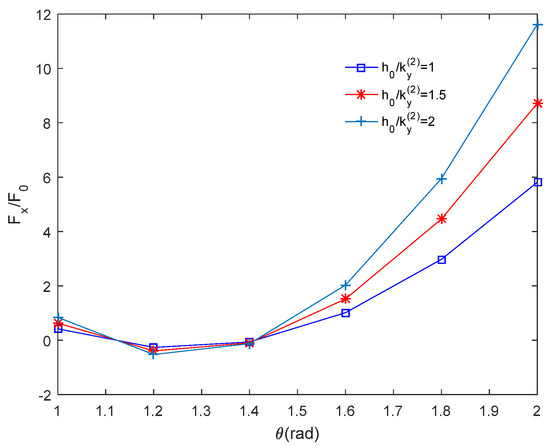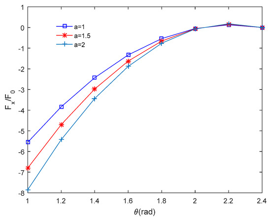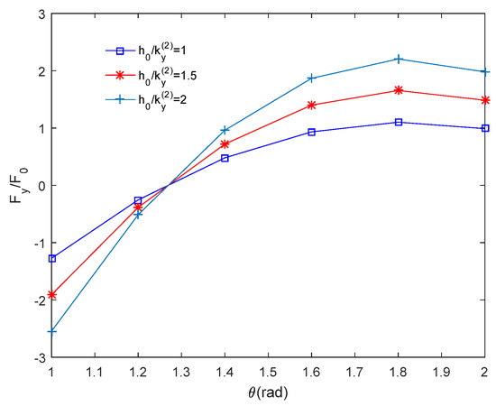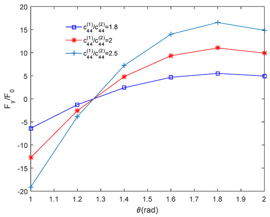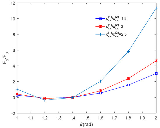 Figure 4 and Figure 5 shows the variation law of image force with angle under different elastic modulus ratio, and the other parameters are: , , , , . It can be seen from the figures that the influence of elastic modulus on image force is similar to that of temperature gradient, that is, image force first decreases and then increases with the increase of , while image force first increases and then decreases with the increase of , however, the peak value of the image force corresponding to the elastic modulus is much larger than that corresponding to the temperature gradient, indicating that the influence of the elastic modulus of the material on the image force is more significant than that of the temperature gradient.
