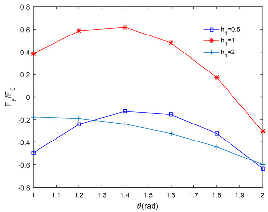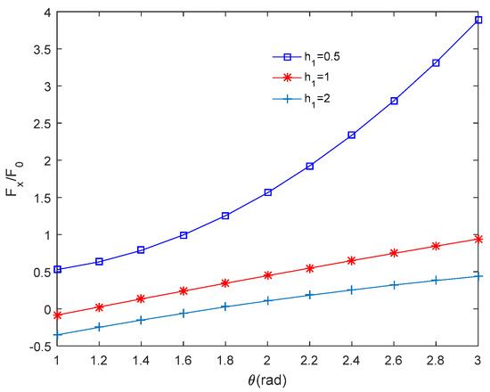 Figure 6 and Figure 7 shows the variation law of image force with angle under different coating thickness, and the other parameters are: , , , , . It can be seen from the figures that image force increases with the increase of , and image force first increases and then decreases with the increase of , but for , image force decreases with the increase of . For the coating thickness , when different values are taken, the image forces and show great changes, indicating that the coating thickness also has a great influence on the dislocation. It is also found that the peak value of image force decreases when the coating thickness is large.