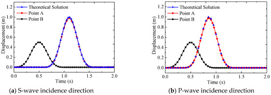 The calculated and theoretical values for points A and B are given in Figure 2. The numerical and theoretical solutions were compared for each condition, and the results showed that they were very consistent. The time history and amplitude of the S and P waves in the numerical verification were pretty accurate, which showed the validity of the wave input method used in this study.