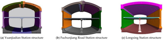 - Ding, P.; Tao, L.; Yang, X.; Zhao, J.; Shi, C. Three-dimensional dynamic response analysis of a single-ring structure in a prefabricated subway station. Sustain. Cities Soc. 2019, 45, 271–286. [Google Scholar] [CrossRef]