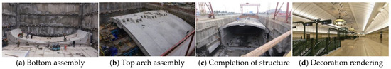 Qingdao metro station, China, was optimized and adjusted based on the prefabricated scheme of Changchun metro, as shown in Figure 3a. The mainlining structure was composed of five precast components, among which, the bottom plate was adjusted from three to one, as shown in Figure 3b. The design of Longxing Station of Shenzhen Metro, China, made use of further optimization based on the assembled scheme of Qingdao metro. The two components of the vault were adjusted to one, and the single ring structure was assembled using only four large prefabricated components, as shown in Figure 3c. The construction process [28] of Yuanjidian Station is shown in Figure 4. The sizes of the three models are not exactly the same. However, in order to focus on the impact of the connecting joints of the vault and the bottom plate on the seismic response of the fabricated station structure, the size of Changchun subway station was taken as the prototype to model Qingdao Subway Station and Shenzhen Subway Station. The fabricated station structure is composed of single ring structures assembled using reinforcement bundles. This study only focused on the lateral seismic response of the single-ring structure and did not consider the longitudinal seismic response of the station structure.