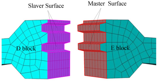 The joint compression damage index () is the maximum value of the contact surface’s compression damage index between block S and block M. is defined as the compression damage index of the contact surface between block S and block M, as shown in Equation (8):