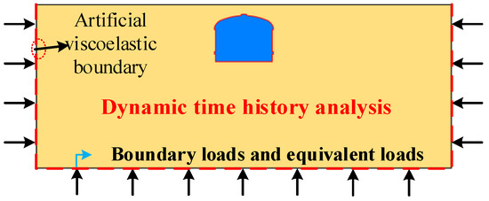 The viscoelastic boundary could simulate the elastic recovery effect of a far-field foundation and had good stability under the action of seismic waves with low frequency and high frequency in previous studies [34,35,36]. In the seismic analysis of underground structures, the finite soil range is usually cut off and a reasonable artificial boundary is set to simulate the seismic reflection and damping effect of an infinite foundation. The equivalent nodal force of an artificial boundary and artificial viscoelastic boundary are combined, and the application of an equivalent nodal force on the artificial boundary is realized. The key to the artificial viscoelastic boundary is to choose a proper spring stiffness and damping coefficient. K and C are the spring stiffness and damping coefficients, respectively, which can be expressed as follows according to Liu and He’s research [35,37].