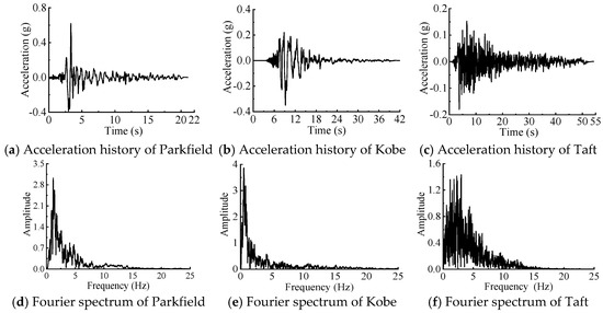 According to the soil characteristics of the site where the station is located, three real seismic waves from the PEER (Pacific Earthquake Engineering Research Center) were selected as the input ground motions, namely, the Parkfield wave, Kobe wave, and Taft wave. Usually, the peak acceleration of the vertical component is half to two-thirds of the peak acceleration of the horizontal component [39]. The peak accelerations of different horizontal components (0.1 g, 0.2 g, 0.3 g) and seismic excitations in different directions were considered. The peak acceleration of the vertical component was two–thirds that of the horizontal component. The recorded seismic wave time history and Fourier spectrum are shown in Figure 8.