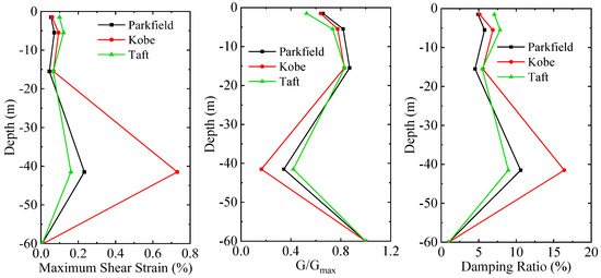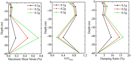 In EERA software, the equivalent linearization method was used to calculate the equivalent shear modulus and damping ratio by calculating the Gmax/G–shear strain and damping ratio–shear strain relationship of soil, which were used in the dynamic time history analysis of the numerical model. Figure 9 shows the equivalent linearization parameters of soil under different seismic motions. Figure 10 shows the equivalent linearization parameters of soil under different seismic intensities.